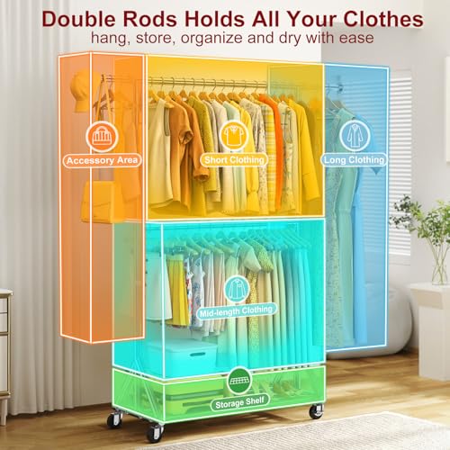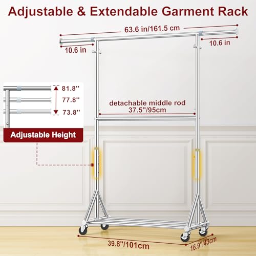 100% Stainless Steel Heavy Duty Clothes Rack Load 860LBS, Rolling Double Rods Clothing Racks for Hanging Clothes, Adjustbale Garment Rack With Sturdy Wheels Shelf, Portable Closet Rack Free Standing