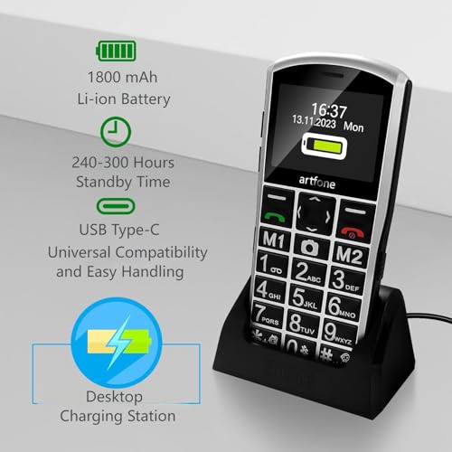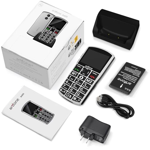 artfone A400 Pro Silver - Large Button Cell Phone for Seniors丨4G LTE Unlocked Phones with SOS Button丨2MP Rear Camera丨Charging Dock丨1800mAh丨Dual SIM丨Speed Dial丨Volume Boost丨Hands-free丨Dumb Phone丨USB-C