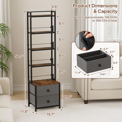 Epouseter CD Storage Rack with Drawer, 5-Tier DVD Organizer Shelf w/Adjustable Book Stoppers, Media Storage Rack for CD/DVD, Books & Games, Ideal for Living Room & Home Office – 15.7x11.8x56.5Inches