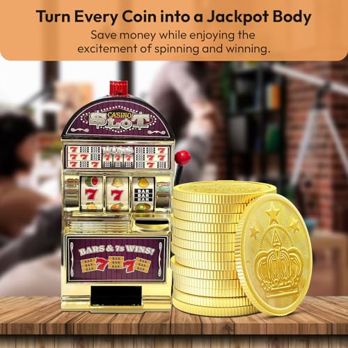 Gold Slot Machine 777 Toy Bank Replica with Lights, Sounds, 50 Metal Gold Coins, Casino Style