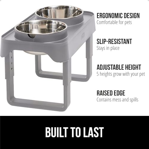 Gorilla Grip Elevated Dog Bowls, 5 Height Adjustable Raised Food and Water Stand for Dogs and Cats, Sturdy Feeding Station with No Spill Stainless Steel Bowl Set for Small, Medium, Large Pets, Gray