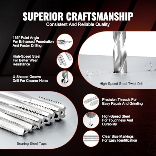 Helicoil Thread Repair Kit, SAE HSS Drill Helicoil Repair Kit, with Drill Bits Thread Inserts Taps Breakoff Installation Tools 14.76 In. L X 7.28 In. W X 1.3 In. H