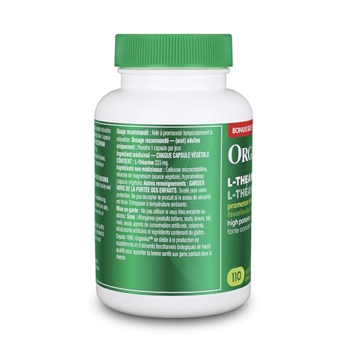 Organika Canadian-Made L-Theanine Bonus Size 225mg-Relaxation Promotion Without Drowsiness, Stress Support, Pure Natural Source, Fast Acting- 110caps