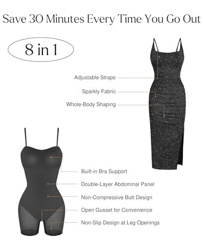 Popilush Shapewear Dress Sparkly Cocktail Dresses for Women Tummy Control Square Neck Ruched Midi Dress with Side Slit Black