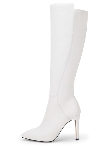 Rilista Womens Knee High Boots Sexy Pointed Toe Stiletto Heel Boot Leather Zipper Dress Shoes, White, Size 8