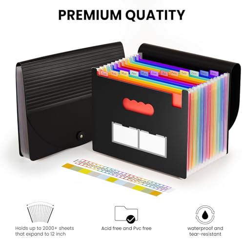 Sooez Accordion File Organizer, 13 Pockets Expanding File Folder, Portable Monthly Paper Bill Tax Receipt Organizer, Letter A4 Size Document Holder with Blank Labels, Black