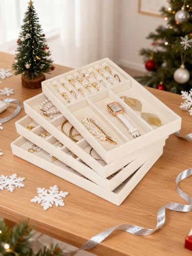 Stackable Jewelry Trays Organizer for Drawer, 4 Set of Jewelry Organizers and Display Case Storage, Velvet Drawer Inserts Organizer for Necklace Bracelets Earrings Organizer-4 Set , Gift For Her,Beige