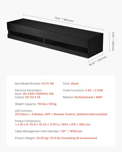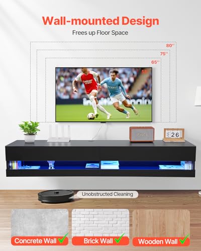 VEVOR Floating TV Stand, 71 in Wall Mount Entertainment Center with Power Outlet & LED Lights, Modern Floating TV Shelf with 2 Drawers & Storage Cabinet for DVD Player, Cable Box, Game Console, Black