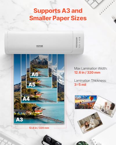 VEVOR Laminator Machine, Cold and Hot Laminator for Max A3 Paper Size, 1 min Quick Warm Thermal Laminator, 3-5 mil Thickness, Ideal for Home, Office, Business, or School Supplies, White + Grey