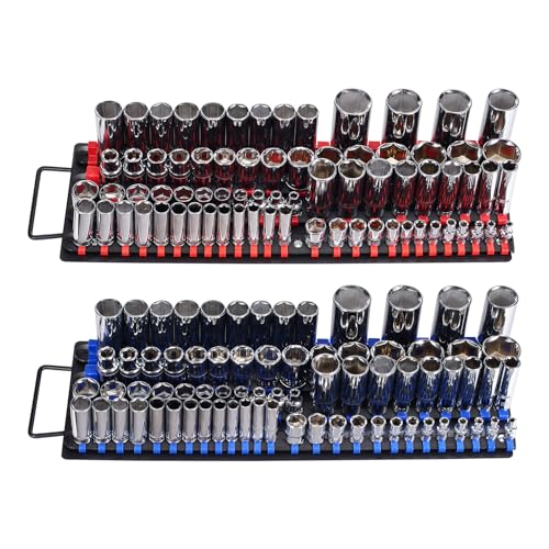 VEVOR Portable Socket Organizer Tray, 2PCS Metric & SAE Socket Organizer Set Hold up to 160 Sockets, 1/4", 3/8" and 1/2" Heavy-Duty Socket Rail with Handle & Steel Base for Tool Box Drawer