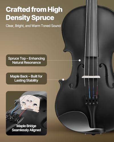VEVOR Violin 4/4 Full Size for Adults, Violin Fiddle Set for Beginners Student with Hard Case, Rosin, Bow, Shoulder Rest, Bridge, Tuner and Extra Strings, Professional Solidwood Instruments (Black)