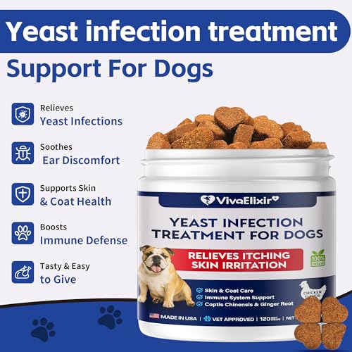 Yeast Infection Treatment for Dogs – Dog Ear Infection | Treatment Dog Itching Skin Relief | Caprylic Acid, & Goldenseal Support Hot Spot Treatment for Dogs Ear Discomfort | 120 Chewable Tablets